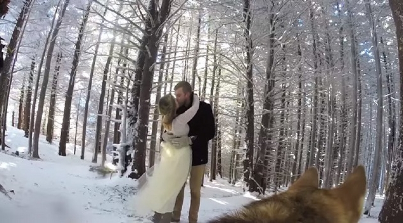 Além de realizarem a troca de alianças na neve, os noivos Josh e Addie Burnette decidiram inovar e apostar em um registro bastante diferente do grande dia. Eles instalaram uma pequena câmera GoPro nas costas de Ryder, o cãozinho deles, para mostrar o casamento sob a perspectiva do pet.