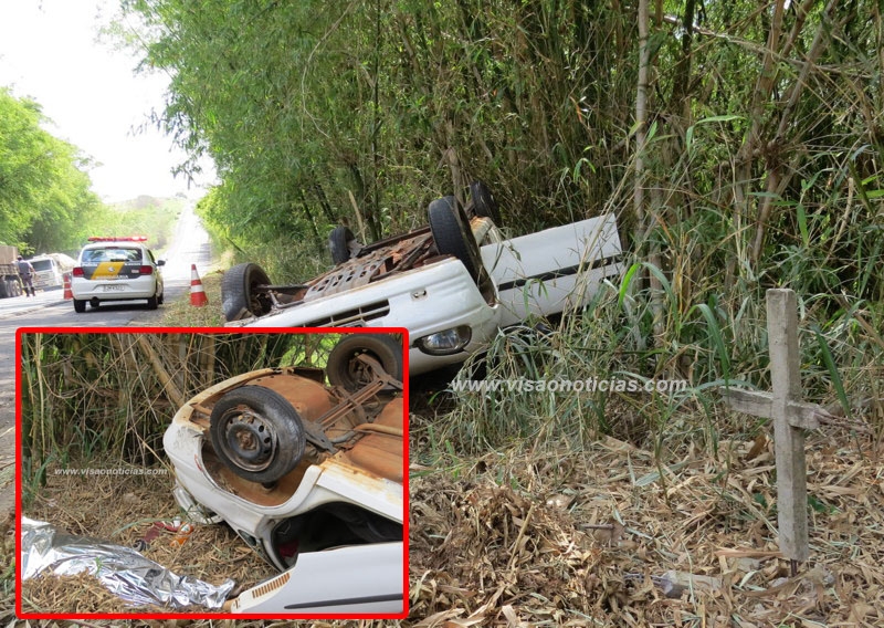 Desgovernado, veículo atingiu a placa e cruzes existentes no local antes de capotar.