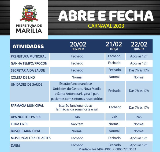 - Estará fechado até quarta-feira às 12h. Em caso de emergência, ligue (14) 3402-1900.