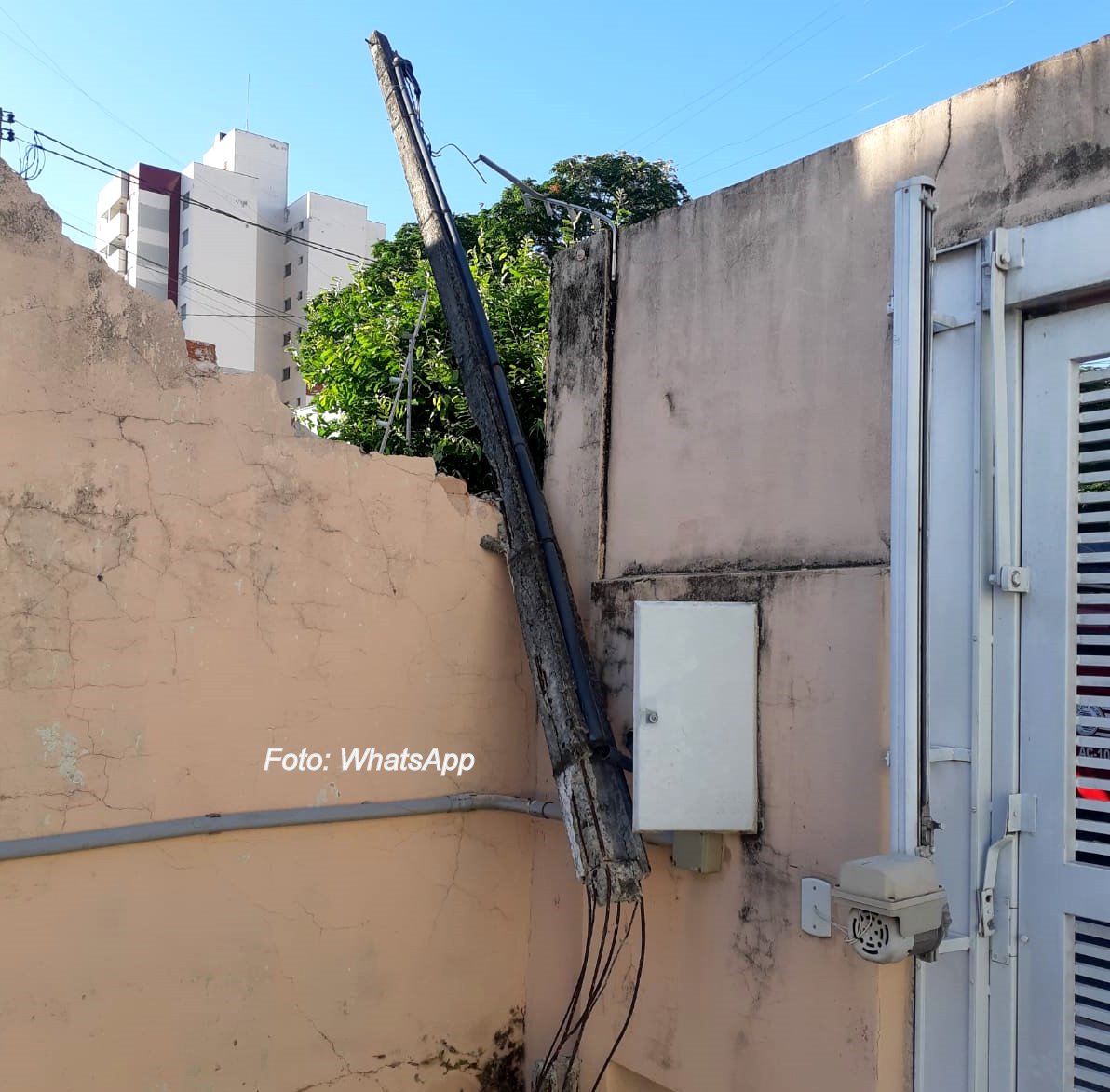 Com o impacto, o fio arrancou o poste de energia de uma casa que, com a força do impacto, acabou destruindo parte do muro do imóvel.