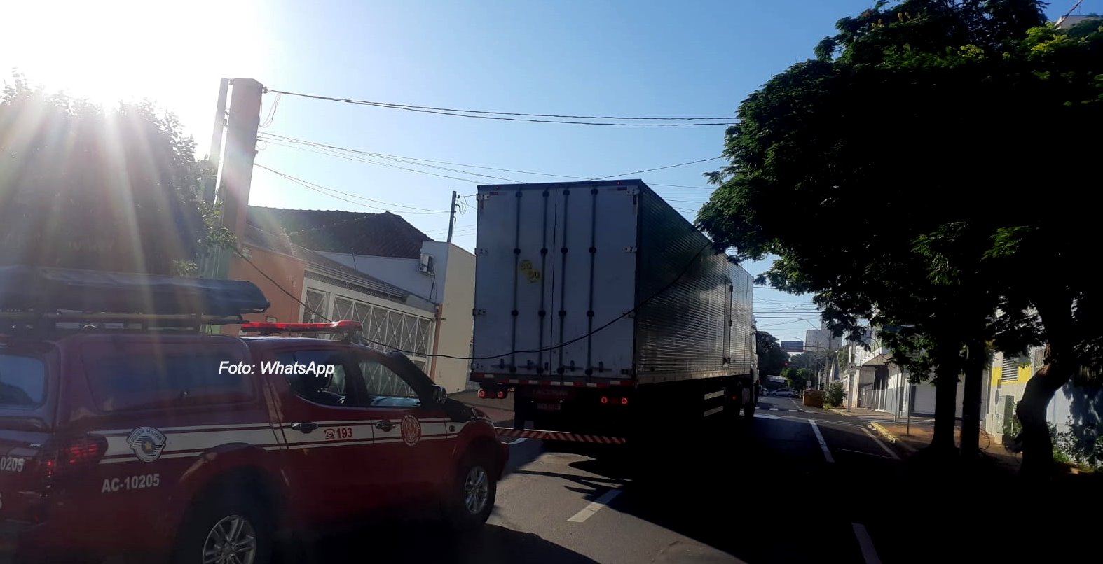Pelo que foi apurado até agora, o motorista de uma carreta seguia pela avenida quando o veículo acabou se enroscando com um fio de energia que estava baixo.