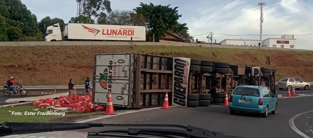 Uma carreta que transportava uma carga de cebolas tombou esta madrugada logo após fazer a alça do trevo da Unimar que interliga a SP-333 à rodovia SP-294, em Marília. O motorista sofreu ferimentos leves e foi socorrido ao Hospital das Clínicas. O local está parcialmente interditado.