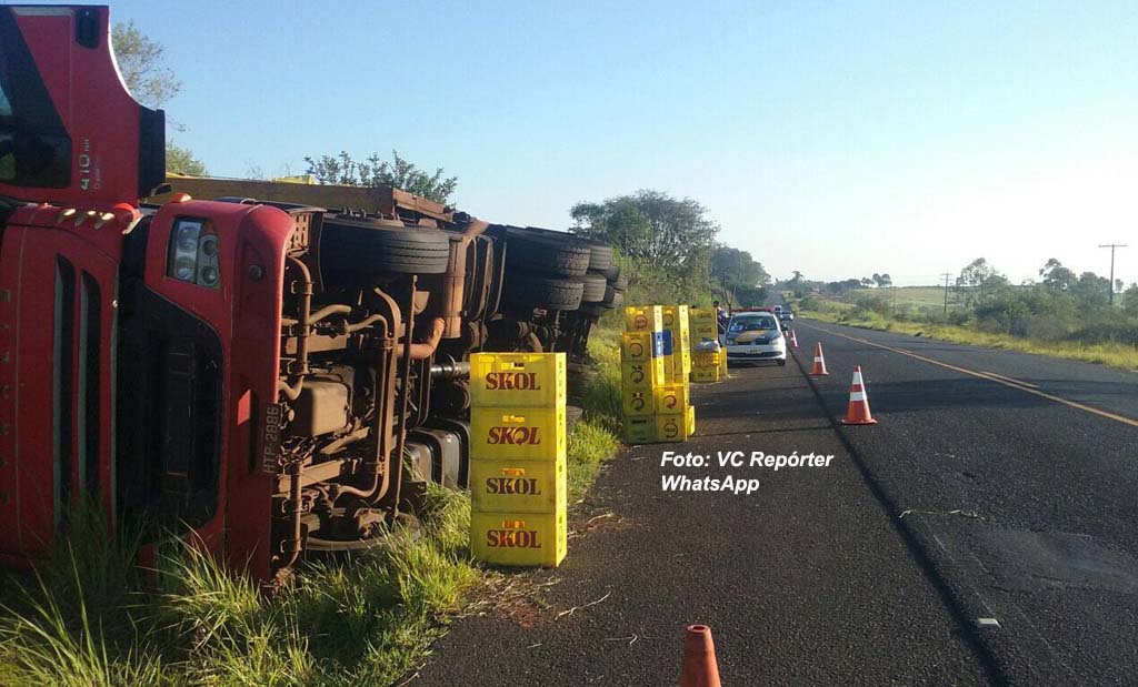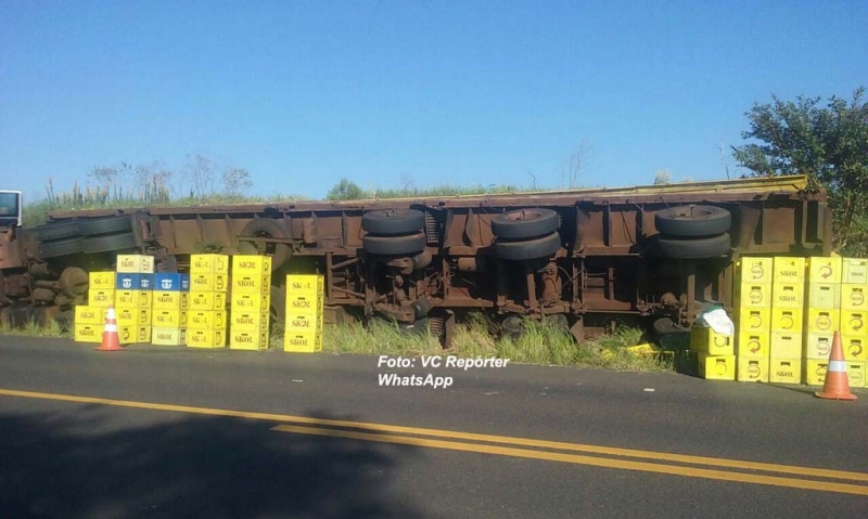 Uma carreta carregada com caixas de cerveja permanece tombada às margens da rodovia SP-421 (José Bassil Dower) há mais de 16 horas. O acidente ocorreu ontem à noite, próximo a Oscar Bressane, sem causar vítimas. Segundo consta, a empresa aguarda a chegada da seguradora para só depois realizar o transbordo da carga.