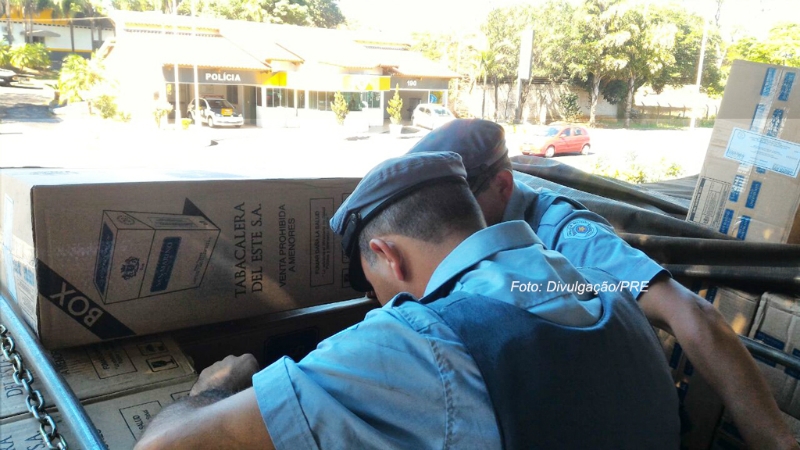 Patrulheiros removeram a lona e encontraram a carga de cigarros contrabandeados.