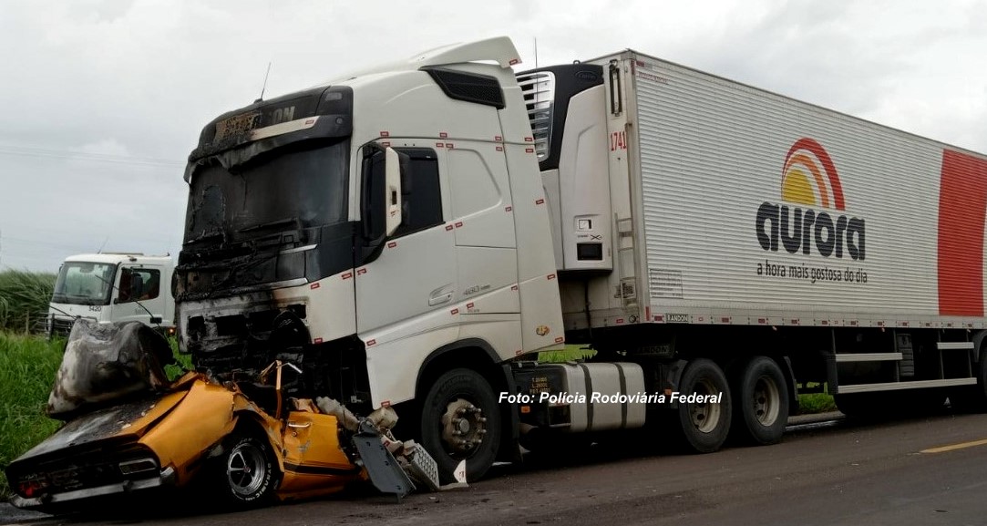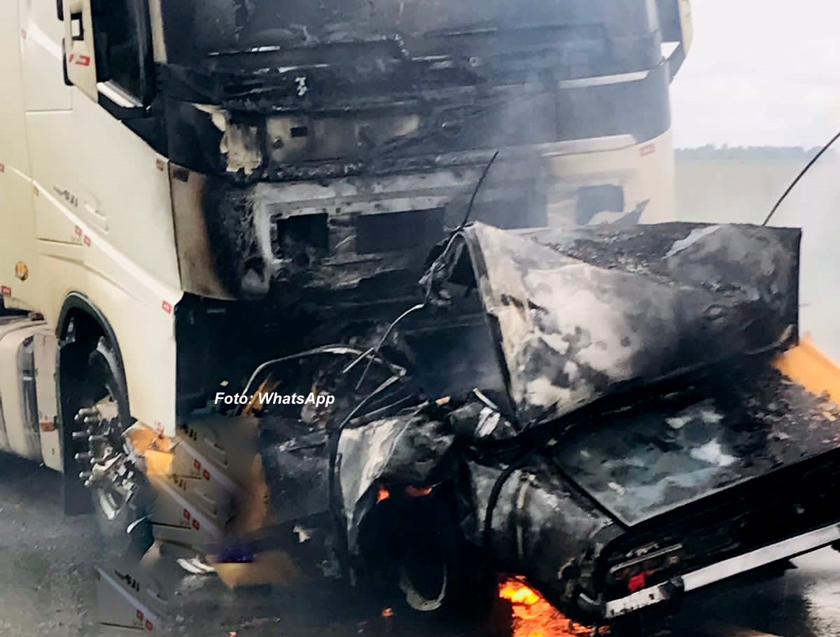 Vítima teria tentado uma ultrapassagem e carro atingiu a carreta. Os veículos pegaram fogo.