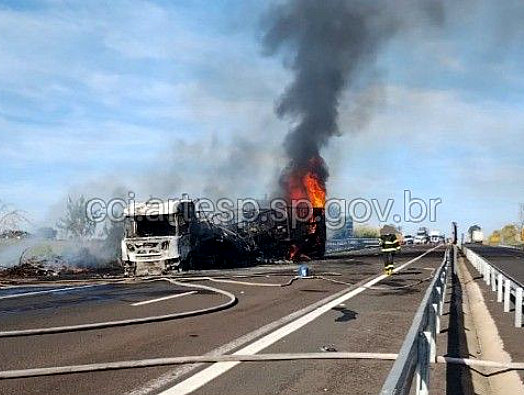 De acordo com relato do motorista ele seguia pela rodovia transportando peças para montagem um silo quando percebeu que o cavalinho (parte dianteira da carreta) começou a pegar fogo.