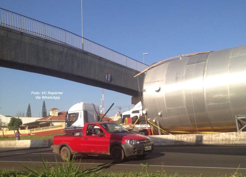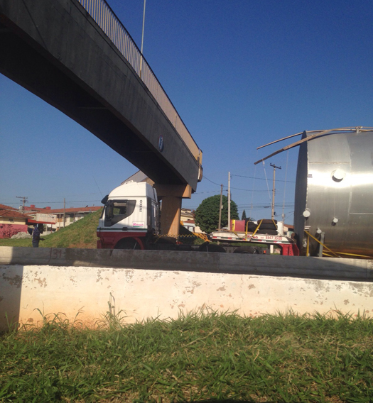 A carreta, transportando um cilindro, está desde o final da tarde de ontem próximo a base da Polícia Rodoviária até que a empresa consiga achar uma solução. Esse tipo de incidente já se repetiu