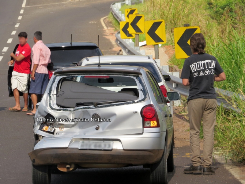 Com o impacto, seu veículo atingiu um Gol branco que estava logo afrente, este, por sua vez, atingiu um Stilo prata.