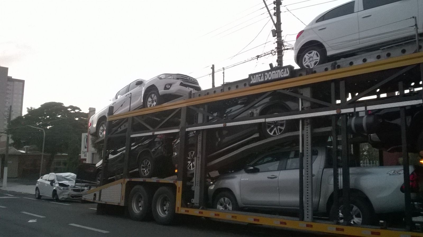No cruzamento das ruas Carlos Gomes com Bandeirantes, uma Carreta cegonha (utilizada no transporte de veículos) ficou enroscada em fios de energia. Quando o motorista tentou manobrar o veículo, um dos carros que estava na plataforma superior ficou enroscado, sendo literalmente derrubado ao chão. Com a queda, de aproximadamente 2 metros, o Chevrolet Onix teve sérias avarias, e provavelmente será considerado como 'perda total'.