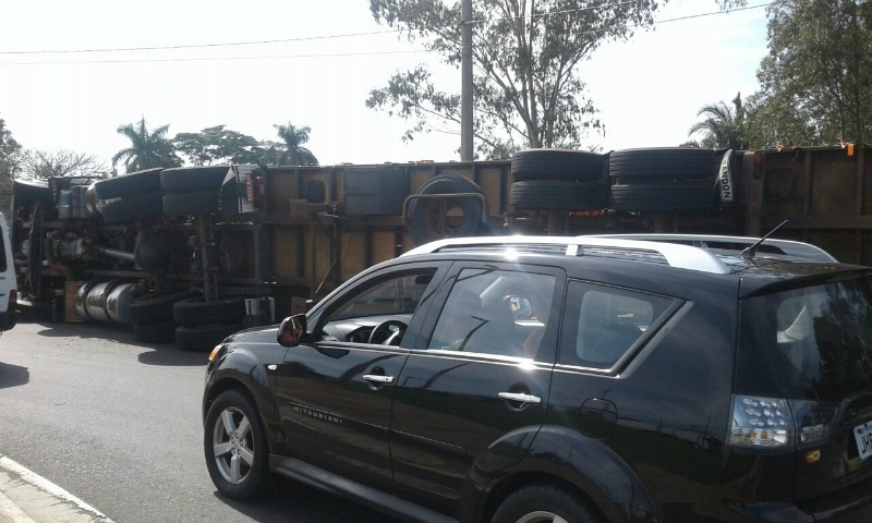 Uma carreta, carregada com madeira, tombou agora há pouco na rotatória da rodovia BR-153, em Marília (trecho urbano - avenida Jóquei Clube). Apesar do susto e dos