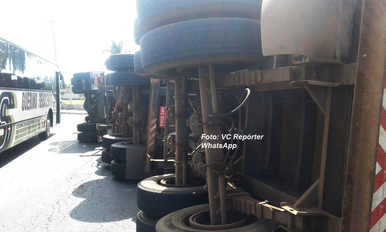 Por motivos que ainda serão apurados, a carga de madeira para móveis (tipo MDF) teria se deslocado, fazendo com que o veículo tombasse.