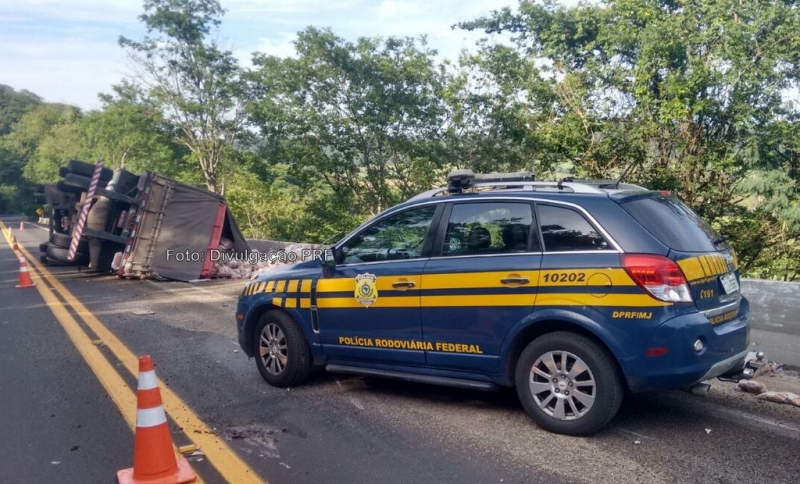 Uma carreta tombou na manhã desta sexta-feira na BR-153. O motorista não se feriu. Sua esposa e passageira teve apenas leves escoriações. O trânsito não teve complicações.