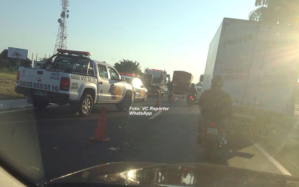 no local, provocando congestionamento e muito trabalho para as equipes da Polícia Rodoviária Estadual e também do Departamento de Estradas de Rodagem. Um dos veículos está sendo retirado neste momento (8h45) do local para desobstruir totalmente a pista.