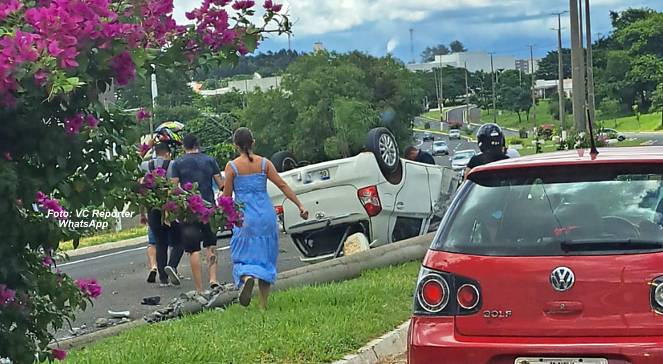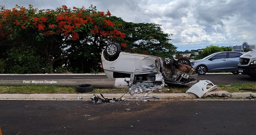 O veículo bateu violentamente contra um poste de iluminação pública instalado no canteiro central da avenida, capotando em seguida. O poste foi derrubado.