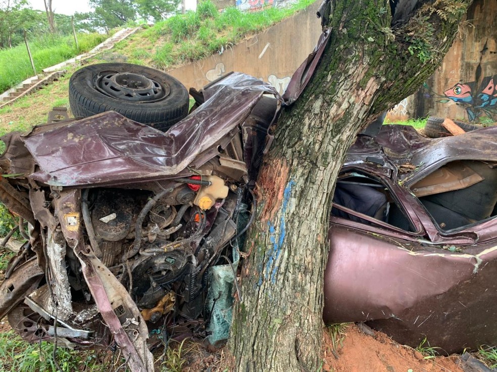 Um carro ficou completamente destruído depois de se envolver em um acidente, em Bauru. Apesar dos estragos, a Polícia Militar informou que as três pessoas que estavam no seu interior foram socorridas conscientes e passam bem.