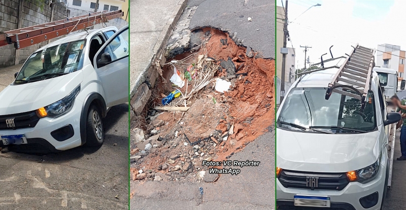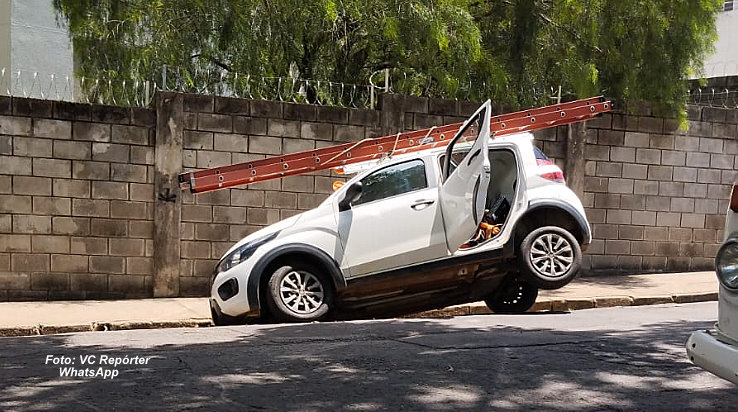 Nesta tarde, o motorista (possivelmente de uma empresa de internet ou telefonia) não percebeu e o veículo acabou caindo no buraco e ficando enroscado.