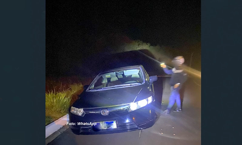 Pelas fotos, o veículo estava sendo ocupado por três pessoas. Os policiais militares iniciaram as buscas e, ao perceberem que seriam abordados, os criminosos abandonaram e fugiram a pé.
