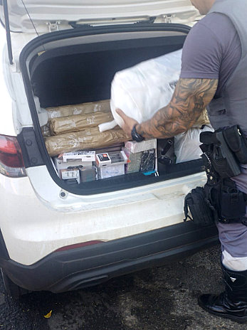 A Polícia Rodoviária Estadual prendeu em flagrante dois homens que estavam em um carro lotado de produtos contrabandeados. As mercadorias estavam sendo trazidas do Paraguai e seriam levadas provavelmente para o Mato Grosso, estado onde moram os dois acusados.