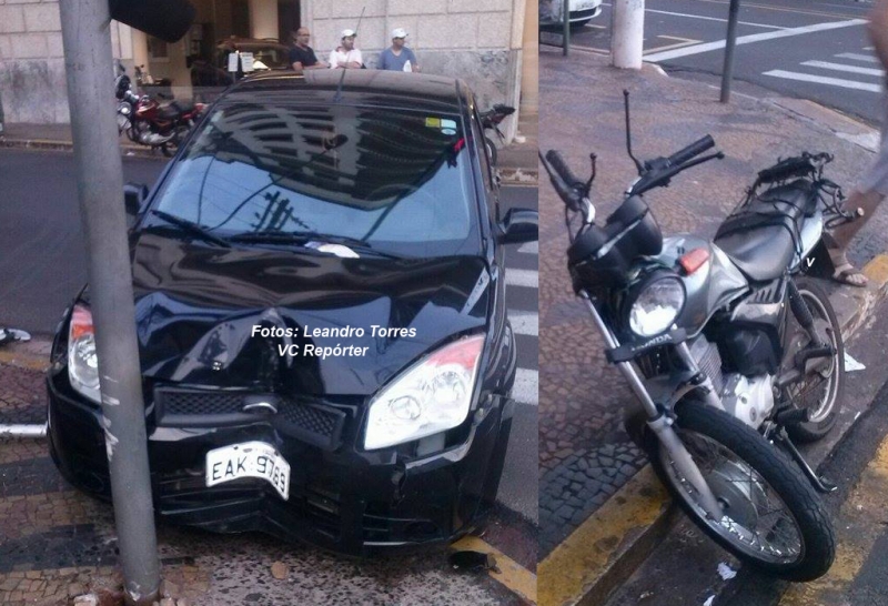 Foi uma colisão envolvendo uma moto e um carro, num dos cruzamentos mais movimentados. O condutor da moto fraturou uma das pernas e o carro por muito pouco não invadiu uma farmácia.