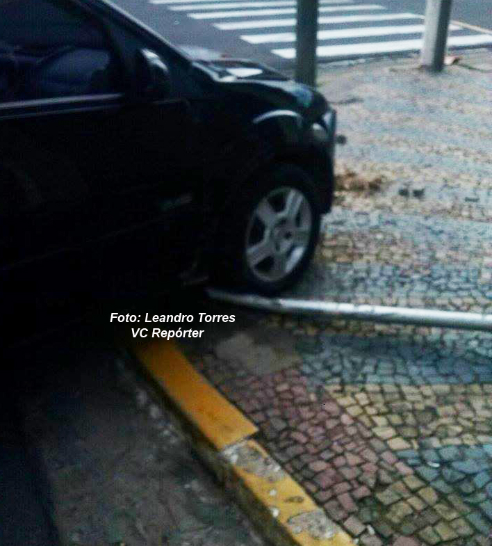 Carro arrancou uma placa e acertou outra. Quase invadiu a farmácia.