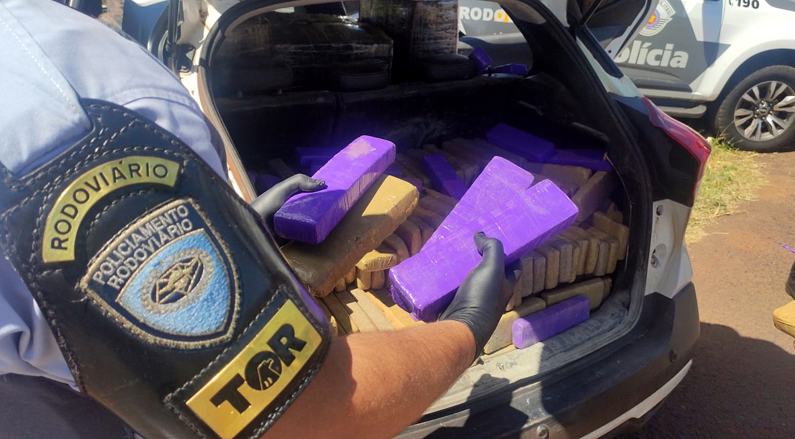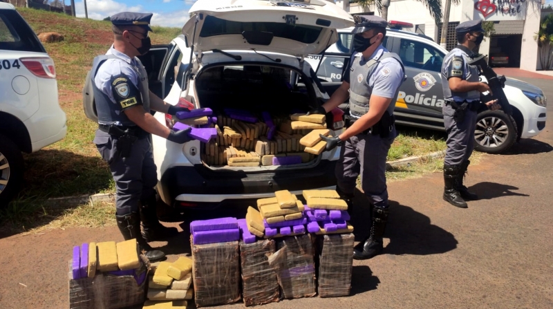 Os policiais do TOR (Tático Ostensivo Rodoviário) abordaram um veículo Nissan/Kicks e, durante a vistoria, localizaram grande quantidade de maconha em vários pacotes no porta-malas e nos bancos traseiros.