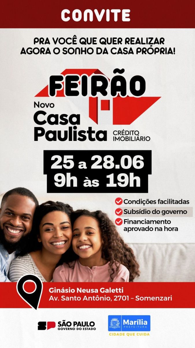 Mais de mil opções de imóveis em Marília que contam com Cartas de Crédito Imobiliário do Casa Paulista, programa da Secretaria de Desenvolvimento Urbano e Habitação (SDUH), serão apresentadas em um feirão a partir desta quarta-feira (dia 25) até sábado (dia 28), das 9 às 19 horas, no Ginásio de Esportes Neusa Galetti (Avenida Santo Antonio). O evento é organizado pelas construtoras responsáveis pelos empreendimentos em parceria com a Prefeitura.