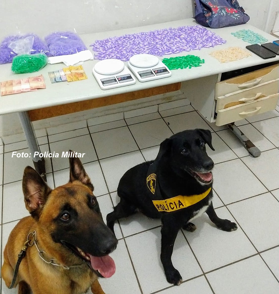 Os PMs pediram o apoio do canil para o prosseguimento das diligências. Os cães farejadores, Pretinha e Seth, detectaram odor de entorpecente no local que o homem havia guardado uma bolsa.