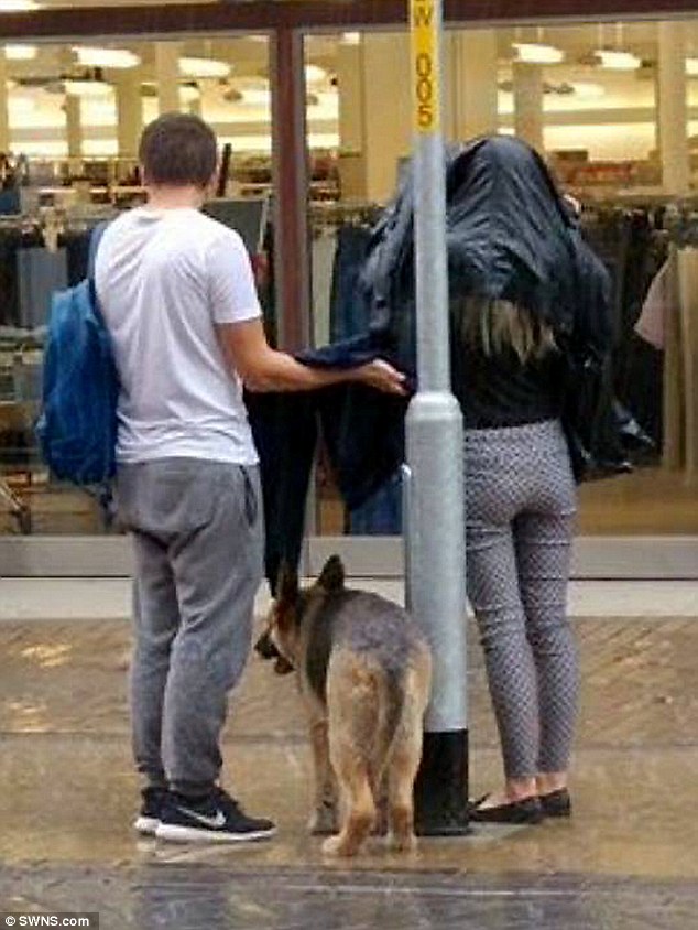 Um casal em Dover, na Inglaterra, parou e ficou auxiliando um cão que estava amarrado a um poste, mesmo que com isso eles tenham ficado ensopados.