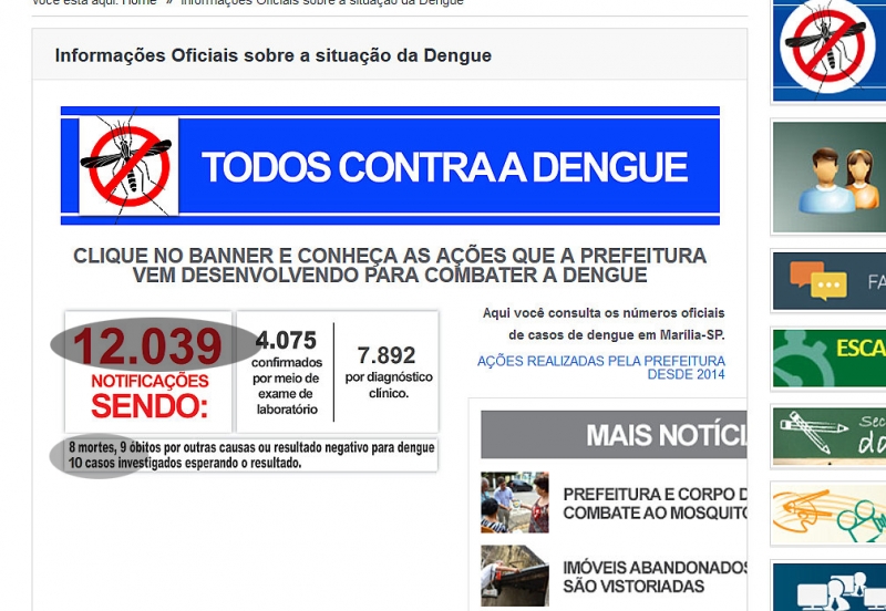 O número de casos confirmados subiu para 12.039, o que equivale a um caso para grupo de 19 pessoas, e o número de mortes também subiu. No último levantamento, eram 10.159 confirmações. Os dados foram atualizados pela Prefeitura neste fim de semana e também indicam oito mortes por dengue (dois novos casos) e outras dez ainda estão sendo investigadas.