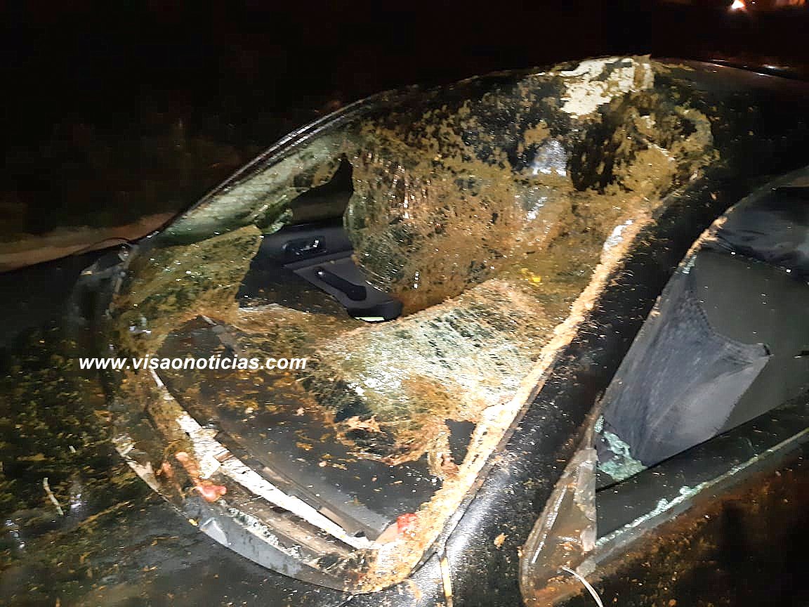 O carro ficou com a frente destruída após atropelar o animal. Motorista saiu ileso, mas o passageiro sofreu ferimentos.