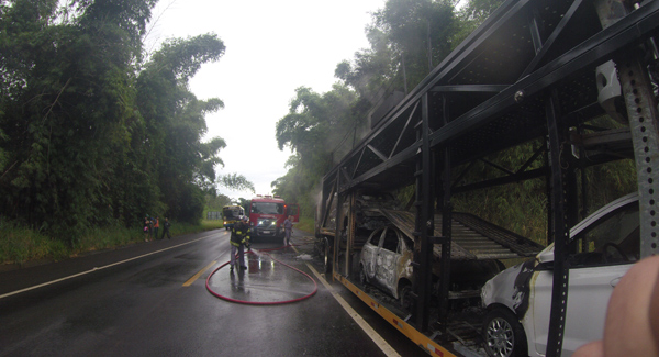 "O primeiro incêndio foi às 2 horas da madrugada e o segundo foi às 6h20. Eu estava trafegando quando houve um curto na caixa de fusível e vi um clarão do lado do carona e uma explosão. Parei a cegonha no acostamento e começou a incendiar. Liguei para o 193", conta o motorista.