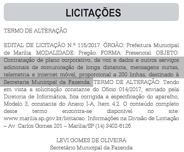 GASTOS - O portal Visão Notícias enviou demanda à assessoria de imprensa perguntando se, justamente num período de dificuldades econômicas, se justificaria uma licitação para contratação dessa quantidade de linhas. A licitação prevê: "Contratação de plano corporativo, de voz e dados e outros serviços adicionais de comunicação de longa distancia, mensagens curtas, telemetria e internet móvel, proporcional a 200 linhas, destinado à Secretaria Municipal da Fazenda".