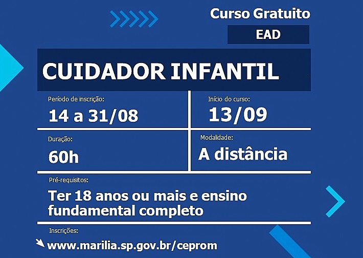 O Ceprom (Centro Profissionalizante de Marília) vai abrir na segunda-feira (dia 14) inscrições para o curso de Cuidador Infantil. A capacitação será na modalidade EAD (Ensino à Distância). Gratuito, o curso terá 60 horas de duração, com início no dia 13 de setembro