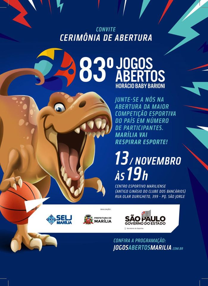 Acontece nesta quarta-feira (13), logo mais às 19h, a solenidade de abertura da 83ª edição dos Jogos Abertos do Interior, no Centro Esportivo Mariliense da Secretaria Municipal de Esportes, Lazer e Juventude – SELJ – (antigo ginásio do Clube dos Bancários).