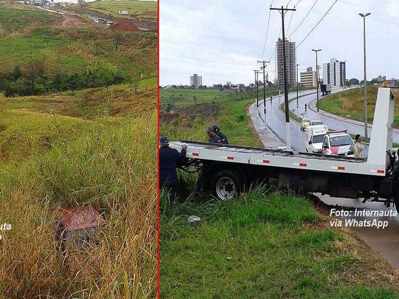 Carro caiu na ribanceira da via expressa. Apesar do susto, ferimentos leves no motorista. Matagal amorteceu a queda