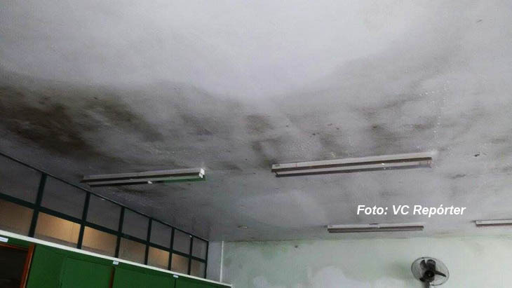 Em outras fotos, o forro está totalmente manchado e já estaria formando mofo e um cheiro insuportável, segundo informam os alunos. A escola tem cerca de 1.300 alunos que estudam em três períodos.