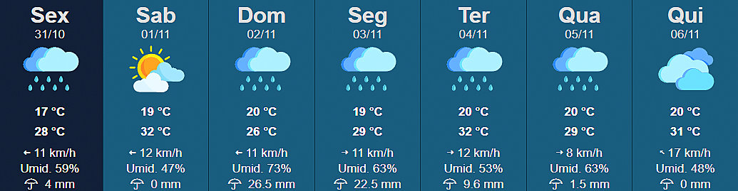 A "virada" de mês (outubro para novembro) está sendo marcada com com tempo fechado e previsão de chuvas em Marília e região inclusive para os próximos dias, segundo o IPMet da Unesp de Bauru. Pelo menos até a próxima quinta-feira o céu deve permanecer nublado, com possibilidade de pancadas de chuva, principalmente a partir de domingo (sábado ainda deve ter sol na cidade).