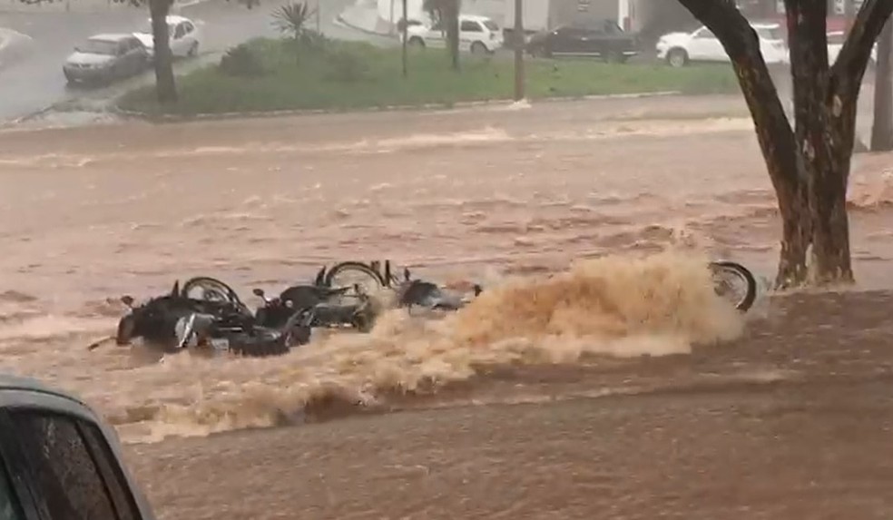 Várias motocicletas que estavam estacionadas na Nações Unidas, na região acima da Avenida Duque de Caxias, foram derrubadas com a força da enxurrada.