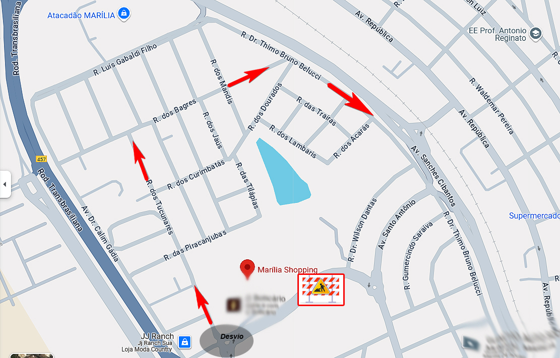 Desvio - Os motoristas que forem utilizar o trecho terão que fazer um desvio pela rotatória do Marília Shopping, seguindo pela rua Tucunarés, contornando o Marília Shopping, segundo pela rua dos Bagres até sair na rua dr. Thimo Bruno Belluci que dá acesso à avenida Santo Antonio. No sentido oposto (centro-bairro), o tráfego de veículos segue normal.