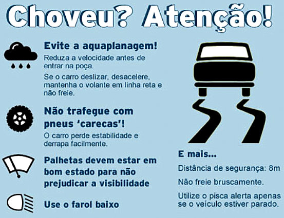 É importante reduzir a velocidade antes de entrar na poça e não circular com pneus ‘carecas’. Mesmo assim, se o carro deslizar, é preciso desacelerar, segurar firme no volante em linha reta e não frear.