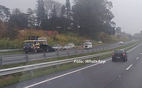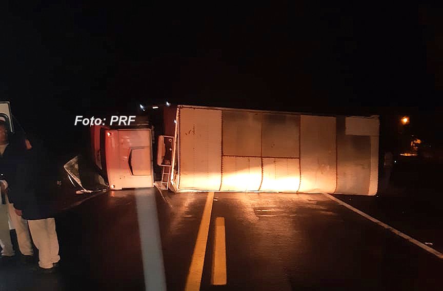 O caminhão ainda não foi retirado do local e permanece tombado na pista. A Polícia Rodoviária Federal solicita a atenção dos motoristas e que tomem cuidado com a pista molhada.