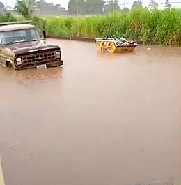 2- Na rua Silvio Bertonha, altura do número 571, no Parque das Indústrias, os funcionários de uma distribuidora ficaram literalmente ilhados devido ao alagamento da via pública.