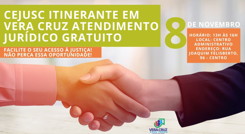 O CEJUSC Itinerante (Centro Judiciário de Solução de Conflitos e Cidadania) será realizado na próxima sexta-feira (dia 8) em Vera Cruz. O objetivo é prestar atendimentos jurídicos gratuitos, disponível à toda a população. O serviço será oferecido das 13h às 16h no Centro Administrativo (Rua Joaquim Felisberto, 96 - centro).