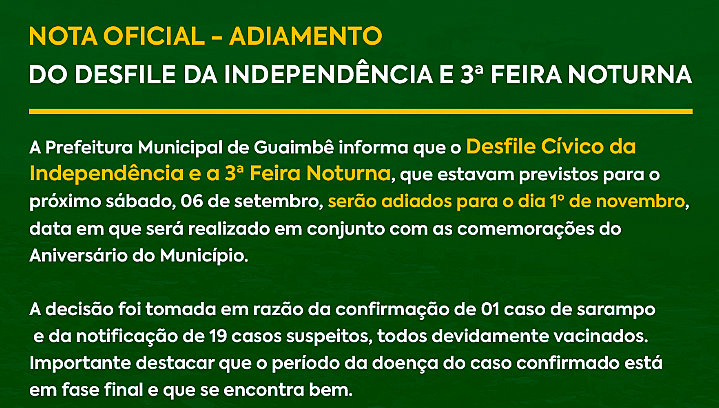 A Prefeitura de Guaimbê (a cerca de 40 km de Marília) cancelou o desfile cívico da Independência e a Feira Noturna que estavam marcados para este sábado (6). O motivo foi a confirmação de um caso de sarampo na cidade. Segundo a prefeitura, outros 19 casos suspeitos ainda estão em investigação.