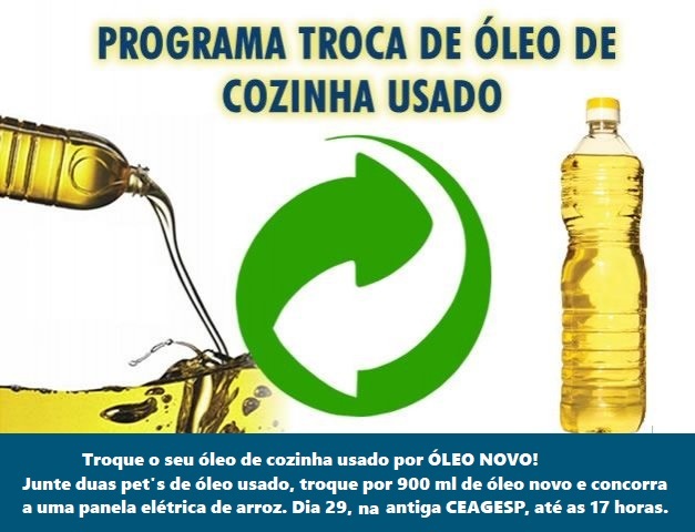Para fidelizar a sustentabilidade das donas de casa, além do direito ao sorteio, o Município, através do Departamento de Agricultura e Meio Ambiente, promove a troca de óleo de cozinha usado por óleo limpo. A troca de óleo acontece toda última quarta-feira do mês, no período das 7h as 11 horas e das 13h as 17 horas.
