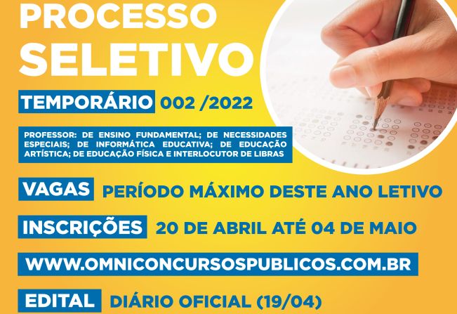 A Prefeitura de Tupã abriu processo seletivo para contratação de professores para o ano letivo de 2022. O edital visa seleção temporária de professor: de Ensino Fundamental, de Necessidades Especiais, de Informática Educativa, de Educação Artística, de Educação Física e Interlocutor de Libras.