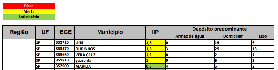 região estão em "amarelo", ou seja, um alerta para o risco de doenças graves, como dengue, zika e chikungunya. O caso mais preocupante é de Lins, com índice 1,8, enquanto que Vera Cruz está com índice 1,2. Marília apresenta ínciee 0,5 e está no nível considerado "satisfatório" pelo Ministério.