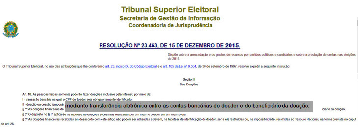 As principais irregularidades encontradas pelo advogado estariam ferindo a Resolução 23.463, no seu artigo 18, ou seja, as doações deveriam ter sido feitas por pessoas devidamente identificadas e somente por meio de transações eletrônicas (TED ou DOC).
