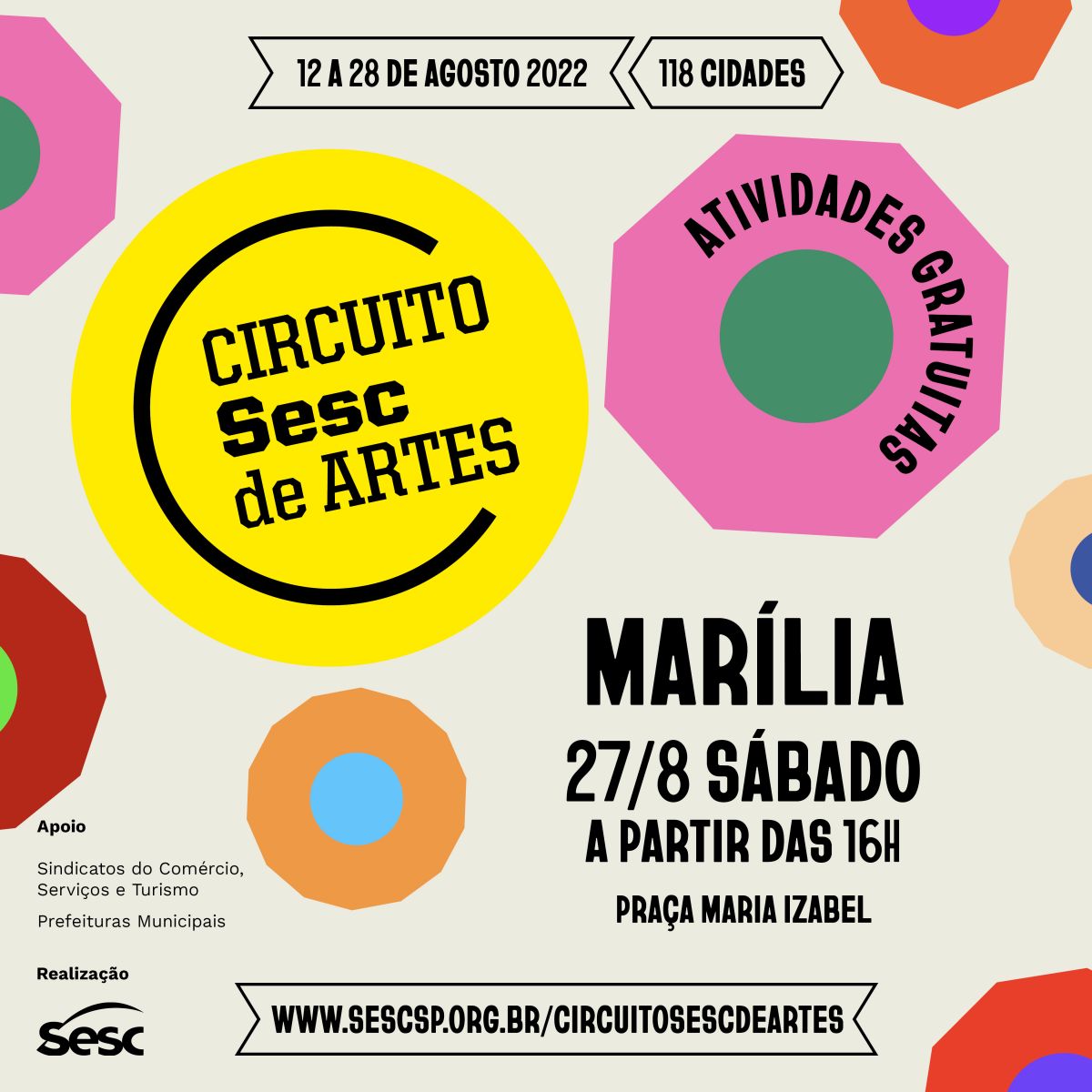 O Circuito Sesc de Artes, promovido pelo Sesc São Paulo em parceria com prefeituras e sindicatos do comércio, serviços e turismo começa nesta sexta-feira e prossegue até o dia 28 de agosto. Serão 85 ações artísticas e educativas em 14 roteiros que percorrem praças e parques durante três semanas.