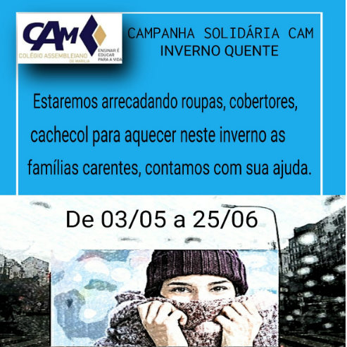 O Colégio Assembleiano de Marília (CAM) está realizando sua segunda campanha social deste ano em prol da comunidade. Com o tema "inverno quente", alunos, professores e colaboradores estão sendo mobilizados para arrecadação de cobertores, agasalhos e roupas que serão destinadas às famílias que mais necessitam.